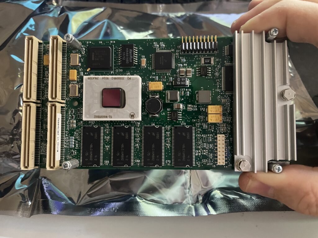 The Emerson-Motorola PrPMC8005E PPC PMC card is mounted to the PMC carrier board. As you see it is a perfect fit. The 3D printed bracket has holes for ventilation.