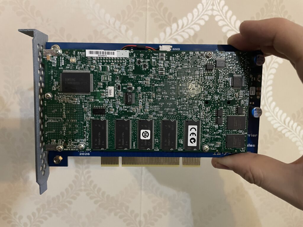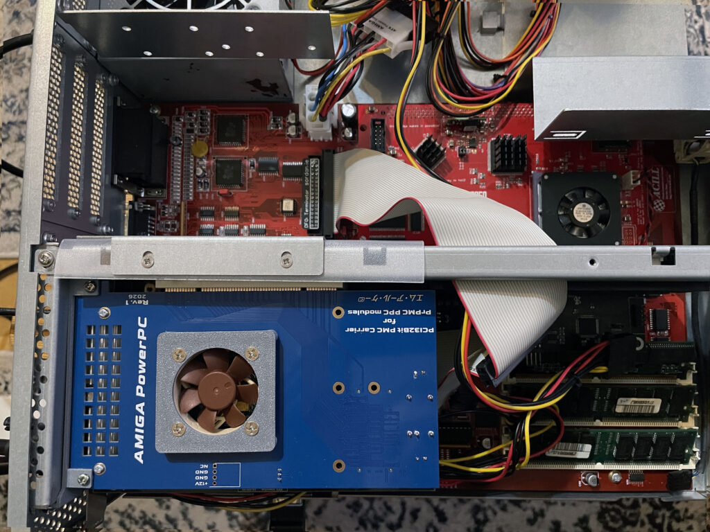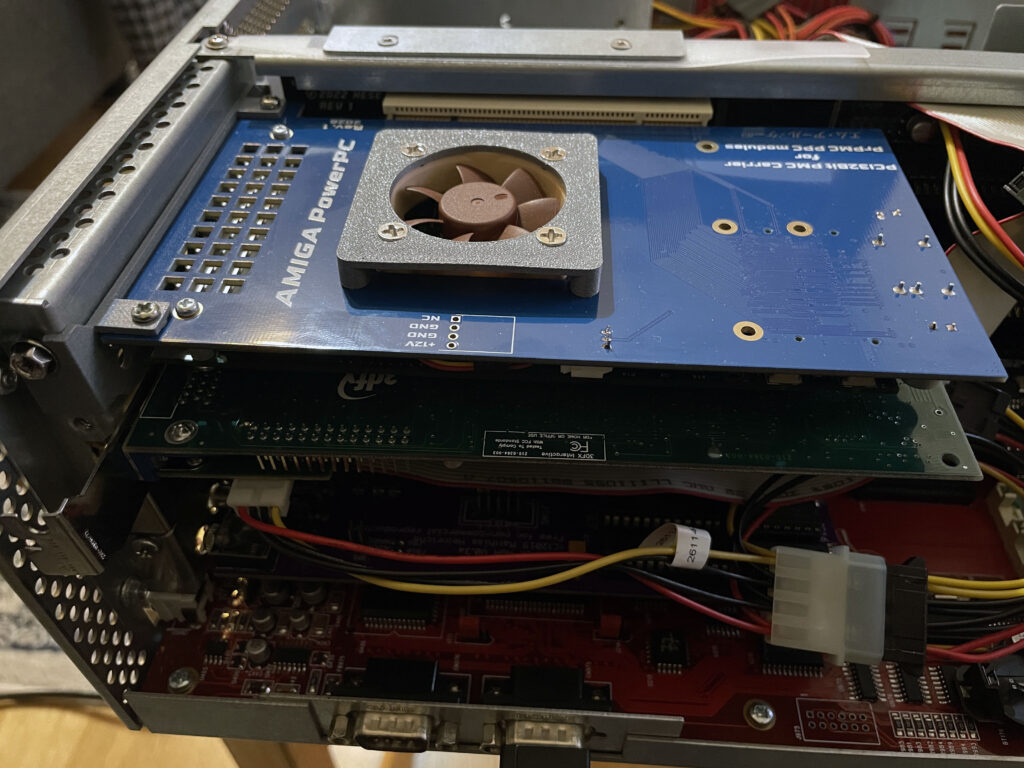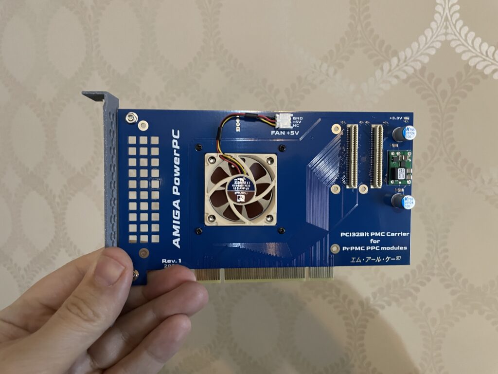So to use the PMC card above on the Amiga you have to add it to a PMC carrier that slots into a PCI slot. This version of the PMC carrier made by a friend in the hobby from a Discord channel we frequently visit. It has a small 40 mm fan to cool the PPC card.