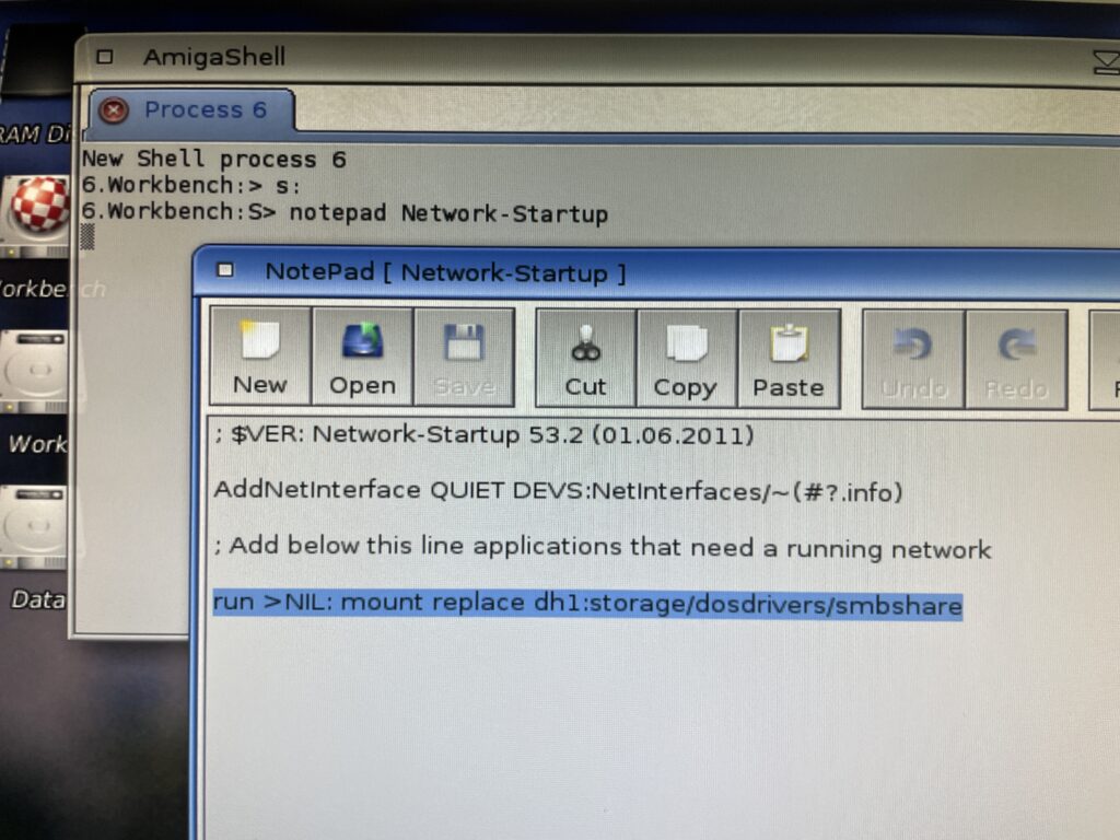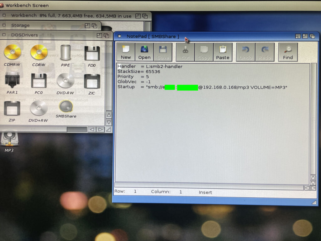 However, I got it to work if I kept the dosdriver in sys:storage/dosdrivers and mounted the dosdriver from CLI by running “mount replace dh1:storage/dosdrivers/smbshare” (if you wonder why sys: is dh1:, that was an error by me during installation, off course it should be dh0:).
